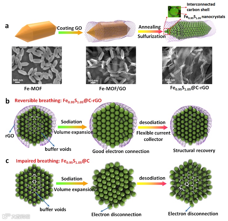 原位透射电子显微镜(TEM)显示,在嵌钠过程中,介孔先被占据以适应体积膨胀,同时整个纳米棒膨胀以释放内应力而不破坏纳米棒结构。在脱钠时,纳米棒收缩并且介孔恢复以维持稳定的结构。因此,Fe0.95S1.05@C纳米棒在完全嵌钠后显示出较小的膨胀,在完全脱钠后显示出较小的收缩。合理设计的Fe0.95S1.05@C-rGO具有高效的离子/电子路径和可逆的电极“呼吸”,可实现出色的倍率性能和超稳定的循环性能。