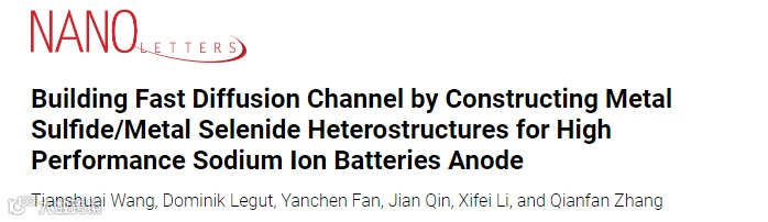 近日,北京航空航天大学张千帆副教授、西安理工大学秦戬副教授在国际顶级期刊Nano Letters (影响因子:11.238) 上发表题为“Building Fast Diffusion Channel by Constructing Metal Sulfide/Metal Selenide Heterostructures for High Performance Sodium Ion Batteries Anode”的研究工作。