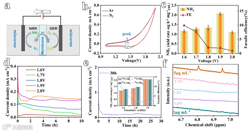 图3. 使用NiFe-nanomesh array作为双功能催化剂进行固氮反应。