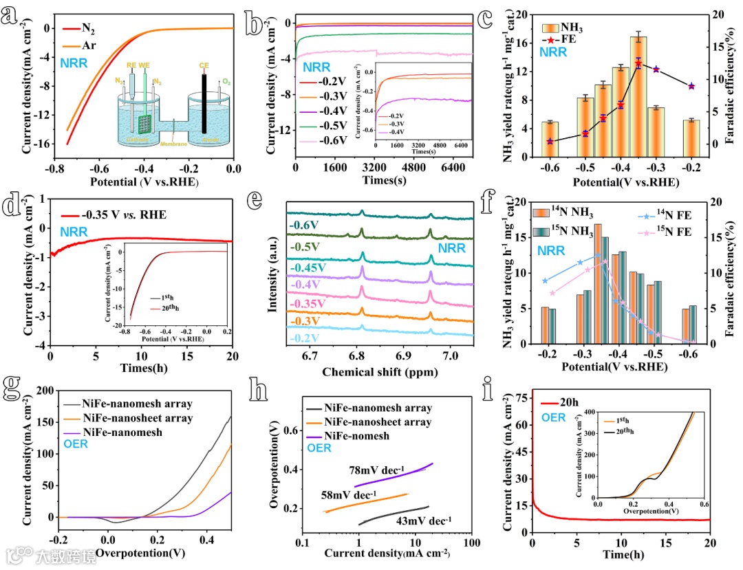 图2. NiFe-nanomesh array的NRR和OER电化学性能。