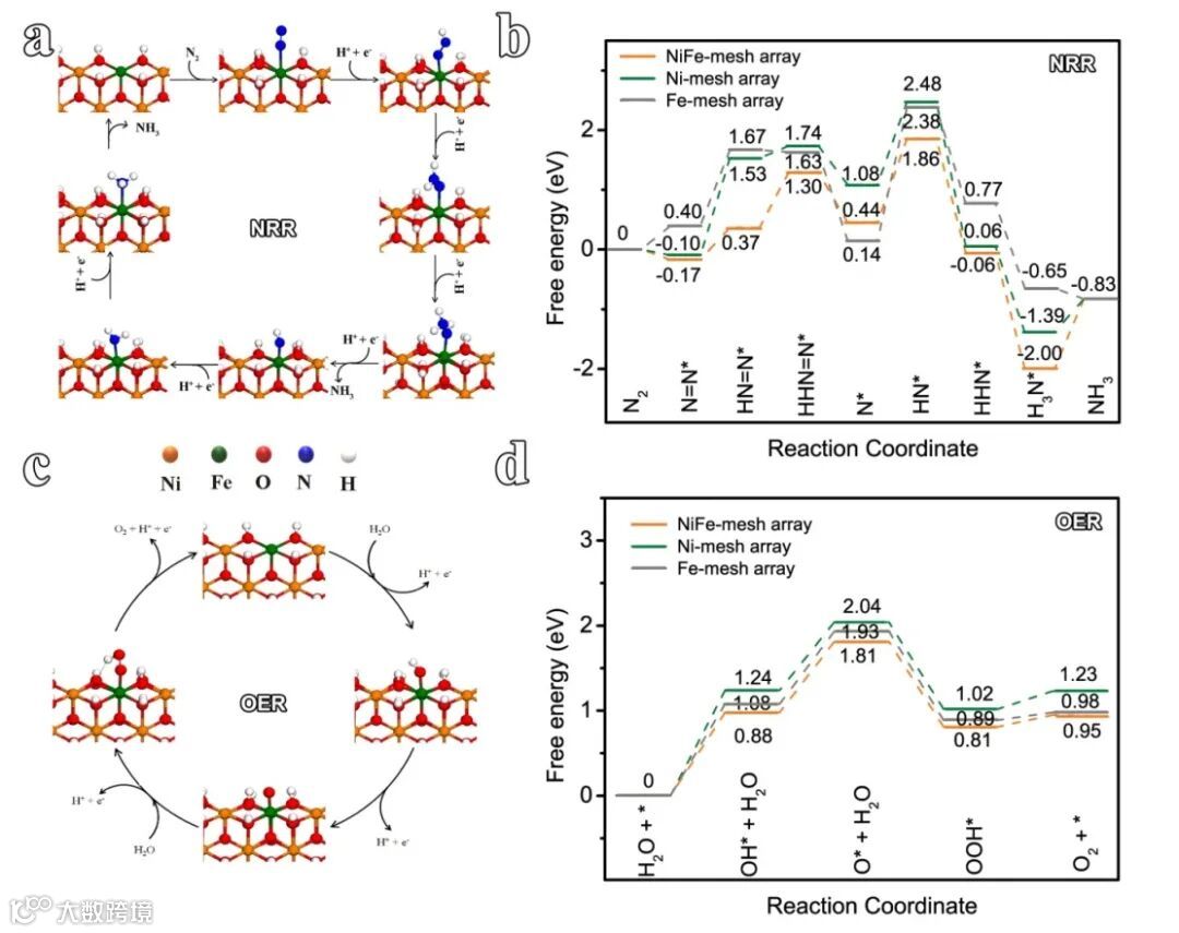 图4. NiFe-nanomesh array 作为NRR和OER催化剂的DFT计算图。