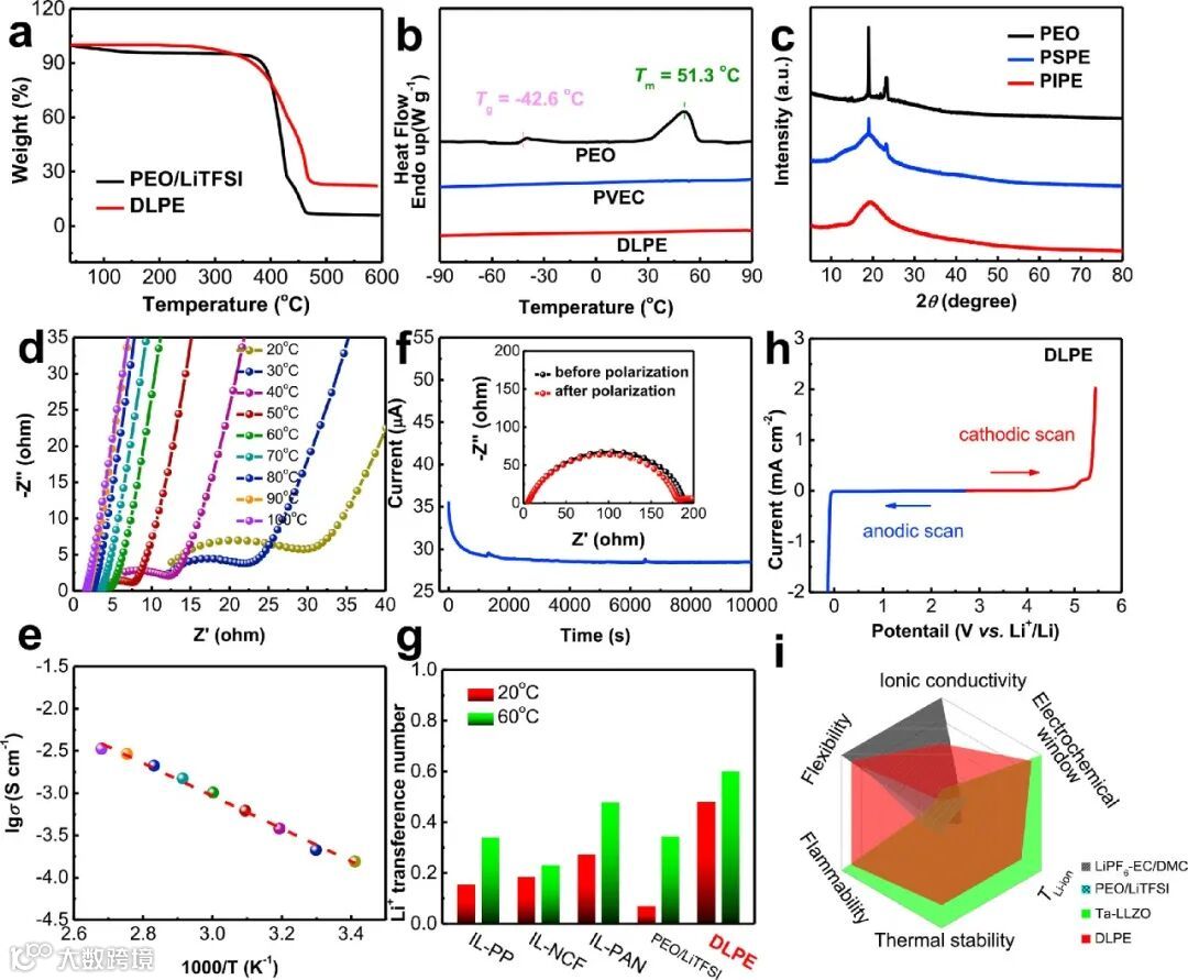 在本工作中,作者提出了一种用于高性能锂金属电池的双层聚合物电解质。该DLPE由聚碳酸乙烯酯-离子液体-与正极接触的LiTFSI和与锂负极接触的聚环氧乙烷-硅胶-LiTFSI组成。该DLPE在20℃下的离子电导率大于10-4 S cm-1,具有宽的电化学窗口(0-5 V)和较高的锂离子迁移数(≈0.602)。