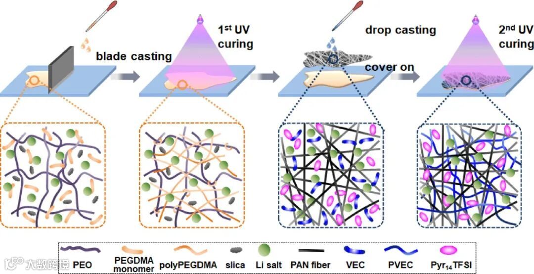 该工作采用液滴铸造和紫外光固化工艺制备了一种新型的双层结构聚碳酸酯-聚氧化乙烯基固态聚合物电解质。所得双层聚合物电解质(DLPE)在高压正极下具有足够的氧化稳定性,在锂金属负极上具有良好的还原稳定性。在这种DLPE中,聚碳酸乙烯酯基聚合物与PAN静电纺纳米纤维和离子液体(Pyr14TFSI)协同作用,以获得与正极接触的抗氧化性能。
