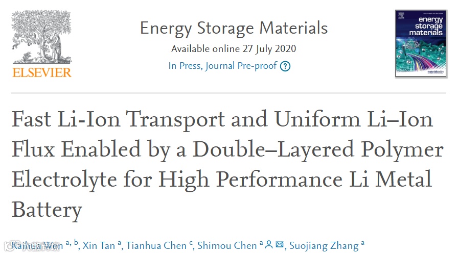 近日,中科院过程工程研究所陈仕谋研究员团队在国际顶级期刊Energy Storage Materials上发表题为“Fast Li-Ion Transport and Uniform Li-Ion Flux Enabled by a Double-Layered Polymer Electrolyte for High Performance Li Metal Battery”的研究工作。
