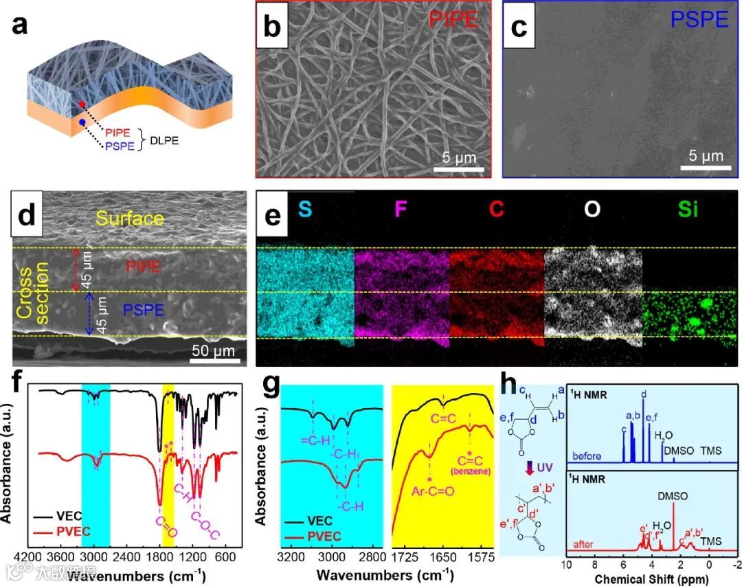 同时,在负极侧,与硅胶复合的聚乙二醇二甲基丙烯酸酯(PEGDMA)与锂金属接触。碳酸乙烯酯(VEC)是一种很有前途的不饱和添加剂,可以在充放电循环过程中在正极和负极表面均匀地自聚合。PVEC具有较高的介电常数,显著促进了Li+在聚合物链上的离解;同时,离子液体为DLPE提供了更多的Li+通道,提高了离子电导率。PAN静电纺纳米纤维为DLPE提供了足够的机械强度,而纳米限制效应不断地阻挡了纤维间隙中的PVEC和IL,保证了DLPE微观结构的完整性。