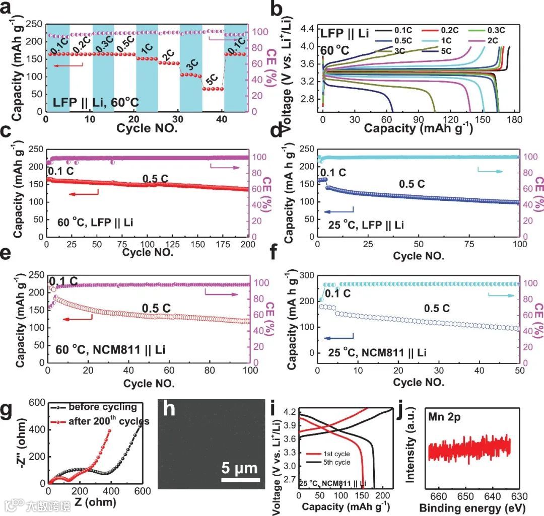 PIPE中PVEC和PAN的协同作用可以有效地改善正极侧的Li+传导,而PSPE中的Lewis酸碱效应可以均匀负极侧的Li+通量。组装的DLPE基LiFePO4和LiNi0.8Co0.1Mn0.1O2锂金属电池在高温(60°C)和室温(25°C)下都具有高容量,并获得了富LiN3和LiF的电解质界面。