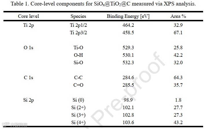 图2展示了SiOx@TiO2@C复合物的表面成分及元素化学状态。图2a中在458.5 eV和464.2 eV所出现的特征峰对应Ti 2p3/2和Ti 2p1/2两种化学状态,显示了TiO2相的成功引入。