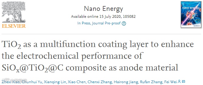 近日,清华大学魏飞教授课题组在国际顶级期刊Nano Energy (影响因子:16.602) 上发表题为“TiO2 as a multifunction coating layer to enhance the electrochemical performance of SiOx@TiO2@C composite as anode material”的研究工作。