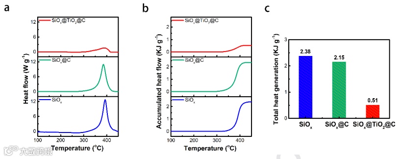 图8b和8c比较并计算了累计热流量,对于SiOx@TiO2@C,其放热量为0.51 KJ g-1,明显低于SiOx的2.38 KJ g-1和SiOx@C的2.15 KJ g-1。放热量降低了4倍,显示了SiOx@TiO2@C的安全性显著提升。