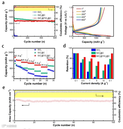 图4c和图4d中显示了在倍率性能上,由于TiO2的引入,SiOx@TiO2@C电极的倍率性能有显著提升,尤其在高倍率下更为明显。在5 A g-1和10 A g-1的高电流密度下,SiOx@TiO2@C电极能够放出1146. 6 mAh g-1和949.7 mAh g-1的容量,显著高于其他二者。当电流回复到初始0.1 A g-1时,容量恢复率高达99.4%,显示了电极的高电化学可逆性。倍率性能尤其是在大电流下的放电能力提升,可以归因于高结晶的TiO2层引入可以为离子电子提供高速传导通道,同时显著提升界面稳定性。