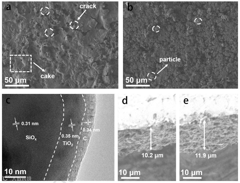 图5a中可以明显看出SiOx电极仅循环50圈后电极就出现明显的结块及皲裂现象,表明电极经历了严重的结构破坏。而图5b中SiOx@TiO2@C电极经历600圈循环后,电极表面结块现象减轻,同时未有明显的开裂现象,表明经过长循环过程电极未经历明显破坏。通过对循环后的电池进行拆解,对于循环后活性物质进行TEM观测可以看出,不同层界限依旧清晰可辨,同时晶格较为完好未有显著变化,证明了整体结构未有显著破坏。