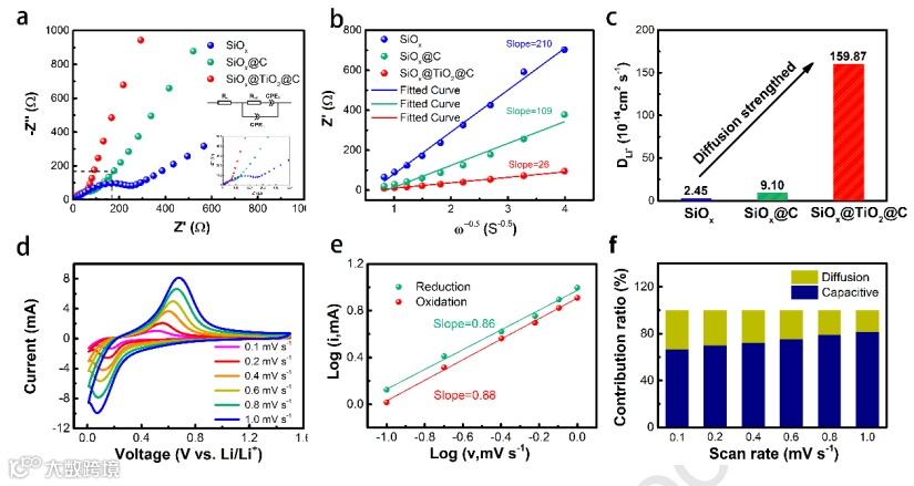 为了进一步理解SiOx@TiO2@C电极倍率性能尤其是在大电流下的放电能力提升,对于电极动力学性质和电荷储存机理做了更为深入的探究。通过电化学阻抗谱(EIS)和循环伏安曲线(CV)对于电化学反应做研究。
