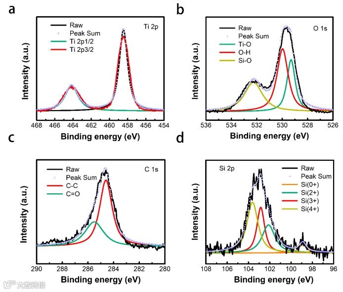 图2b中三种状态的氧特征峰(529.3 eV,530.1 eV,532.3 eV)分别对应于Ti-O、O-H、Si-O,显示了Ti-OH和Si-O键的存在。