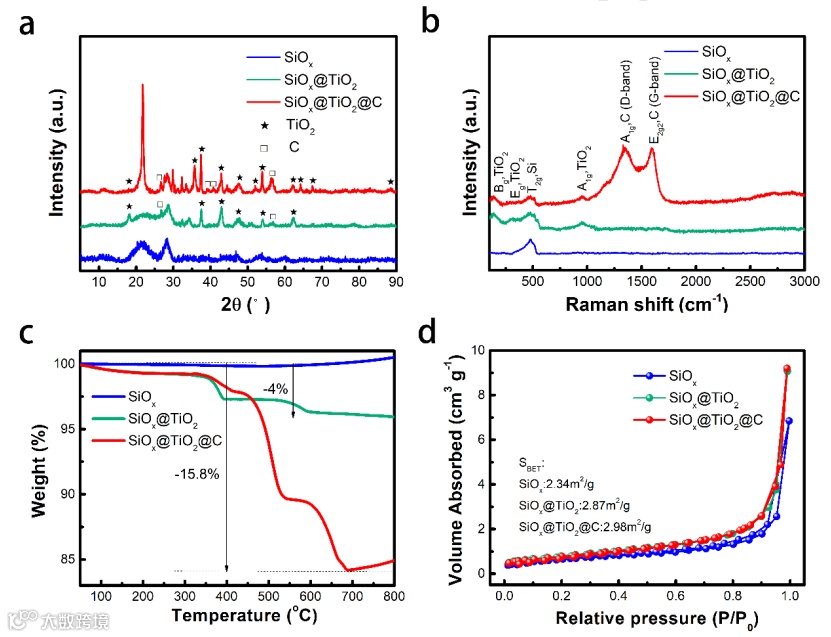 图3展示了不同阶段样品的宏观表征对比。从图3a的XRD谱图中,通过晶相解析,锐钛矿相TiO2的特征峰出现在最后的SiOx@TiO2@C谱图中,进一步确认了TiO2晶相的存在。