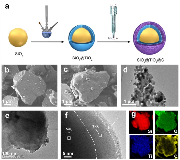图1展示了SiOx@TiO2@C复合物的制备流程,并对于其结构做了相关微观表征,展现了最终产物SiOx@TiO2@C的双层包覆结构。