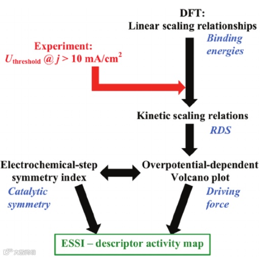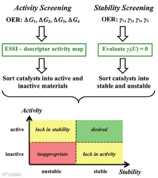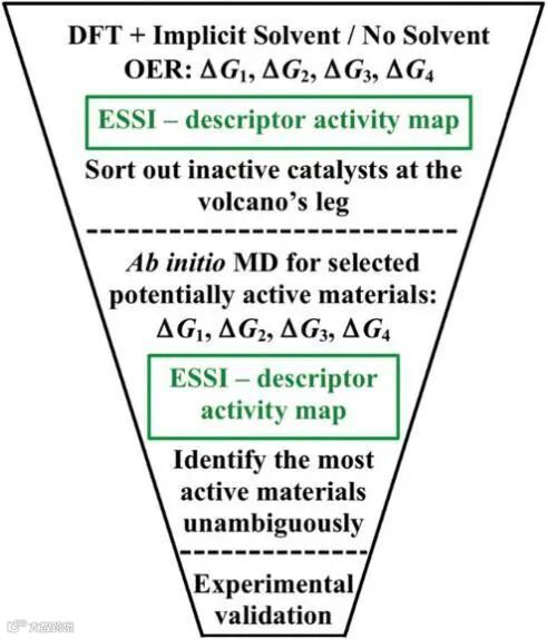 电催化中的筛选方法主要依赖于电化学反应步骤的评估,即使化学步骤可能发生在电催化循环中,如最近文献中对分子或单原子催化剂的报道。这需要在构建ESSI描述活动图或火山图以进行材料筛选时,将通常应用的机械描述(包括OH、O和OOH吸附质)扩展到其他机械路径。在最佳情况下,ESSI描述符活性图中的每种催化剂的性能通过其首选的机械描述进行评估,从而能够根据其机械路径对所研究的材料进行分类。这可能有助于推导出有助于提高我们对OER的原子级理解的结构-活性关系。