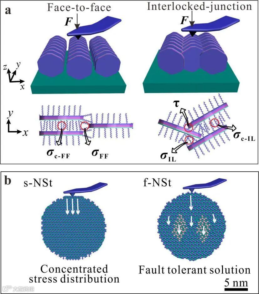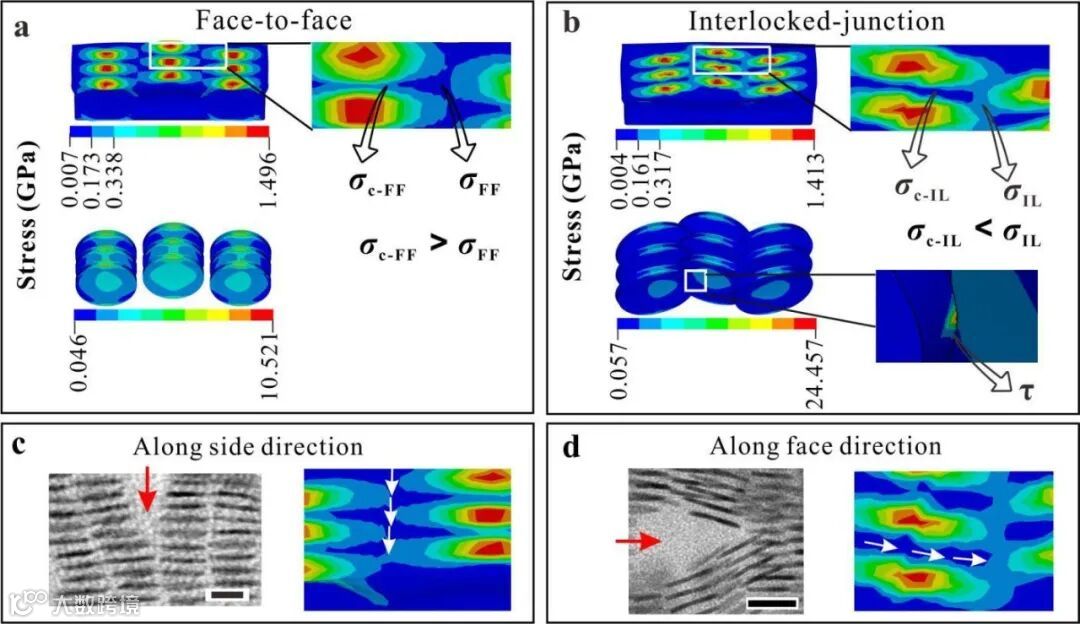 通过不同手段的微观机械实验测试和理论计算分析,我们证明了交错连接的自组装超结构具有比常规的面对面超结构更强的机械性能,并且远优于无序混合结构。有限元模拟分析表明,交错连接超结构机械性能的优越性归因于它独特的应力作用机制:交错区域增强的界面横向张应力和交错位点具有强的界面滑动摩擦阻力。