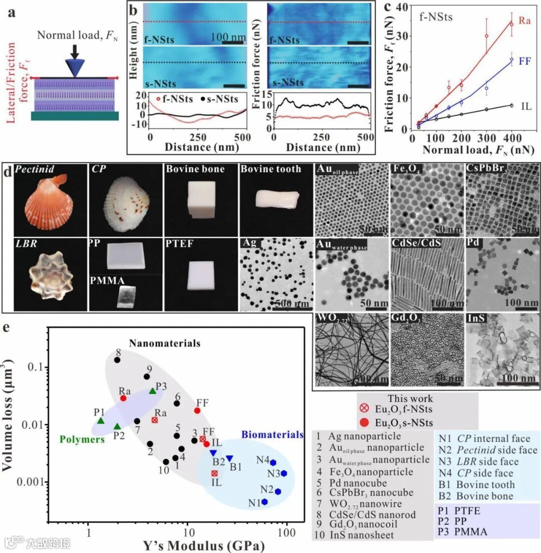 进一步对不同纳米材料、聚合物及自然生物材料的对比分析(图6d,e),显示了结晶缺陷纳米片组装的交错连接超结构具有与自然生物材料相当的耐磨损性能,比其它纳米材料和聚合物的耐磨损性更好。