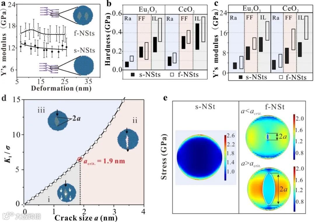 为了证实缺陷容忍性的力学作用机制,我们对比分析了单晶纳米片和结晶缺陷纳米片不同组装超结构的机械性能,结果显示结晶缺陷纳米片均具有更高的杨氏模量和硬度(图5a-c)。