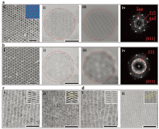 图2a表明制备的单晶纳米片具有很好的晶格完整性,图2b表明制备的结晶缺陷纳米片具有晶面局域缺陷性。图2c和2d展示了自组装的面对面平行排列超结构和交错连接超结构具有很好的长程有序性。
