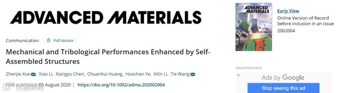 近日,中国科学院化学研究所王铁研究员课题组在国际顶级期刊Adv. Mater.(影响因子:27.398)上发表题为“Mechanical and Tribological Performances Enhanced by Self-Assembled Structures”的研究工作。