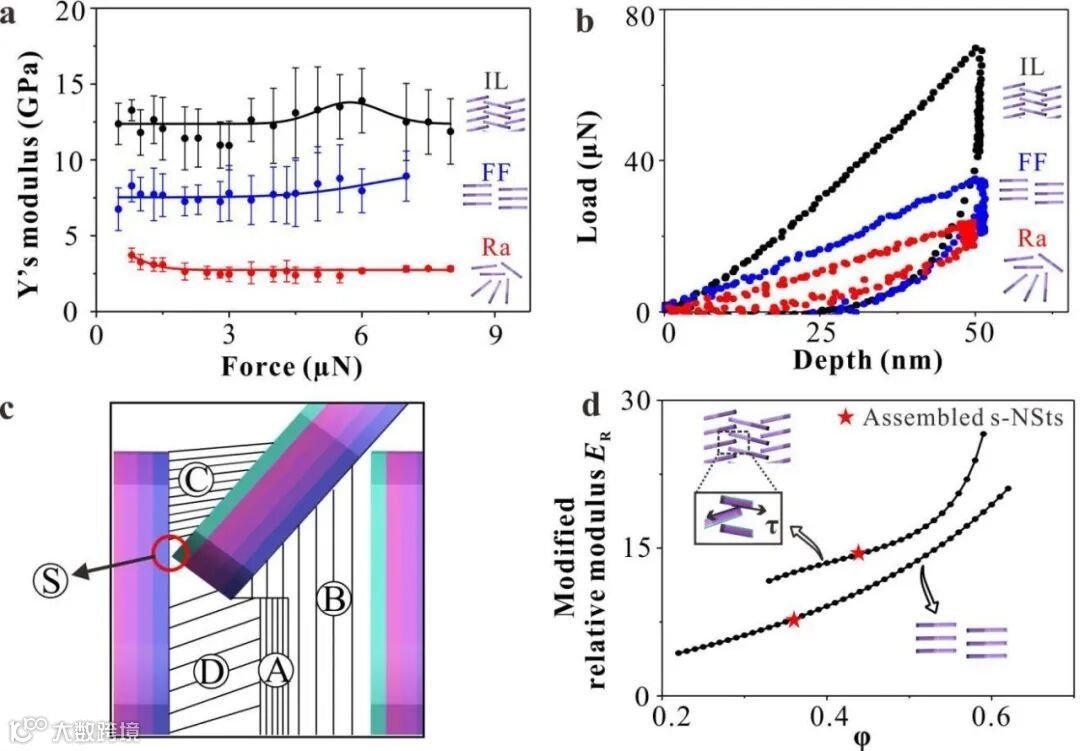 图3. 单晶纳米片不同组装结构的机械性能表征。