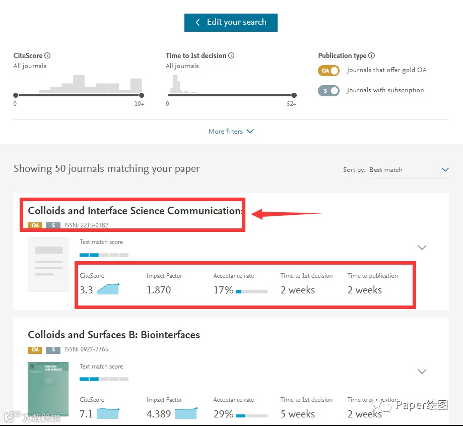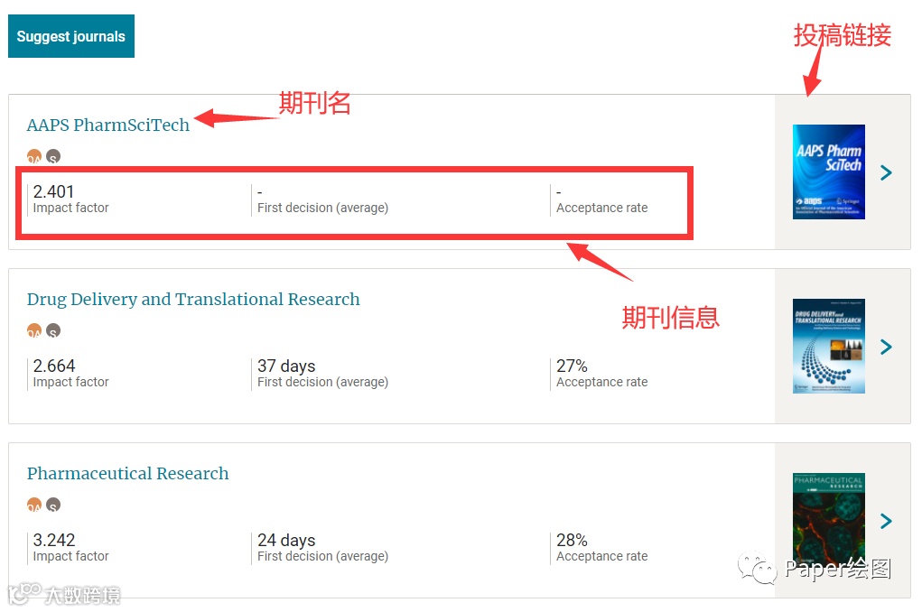 2. 然后就会匹配出相应的期刊,以及接受率,一审回来的时间,以及网站链接,你就可以投稿了