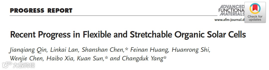 近日,重庆大学柔性可再生能源材料与器件课题组(La FREMD)孙宽研究员、陈珊珊副研究员和韩国蔚山科学技术院Changduk Yang教授团队在国际知名期刊Advanced Functional Materials 上发表题为“Recent Progress in Flexible and Stretchable Organic Solar Cells”的综述论文。