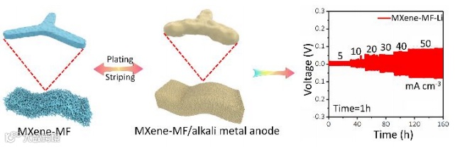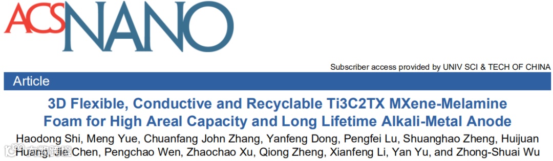 为此,中科院大连化物所吴忠帅研究员,中科大余彦教授等在国际知名期刊ACS NANO上发表题为“3D Flexible, Conductive and Recyclable Ti3C2TX MXene-Melamine Foam for High Areal Capacity and Long Lifetime Alkali-Metal Anode”的论文.