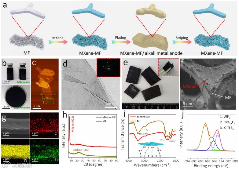 本文作者介绍了一种成本较低、普适性广、简单易行的直接蘸取的策略,即通过氢键的强作用力将商用聚合物三聚氰胺泡沫(MF)浸泡在MXene导电墨汁中,构建一个可循环利用、柔性和导电的三维(3D)MXene-MF复合电极,用于无枝晶、超稳定、高容量的碱金属负极。