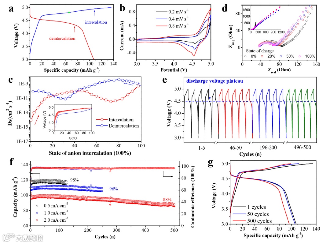 作者采用了MoS2作为正极,锂片作为对电极,电解液采用了PC:EMC溶剂和LiDFOB盐。半电池测试结果表明该材料具有108 mAh g-1的可逆容量,结合循环伏安说明材料在3.0-5.0 V有较明显的阴离子插嵌-脱嵌电流峰,循环曲线证实了该材料的具有较好的循环可逆性和结构稳定性。