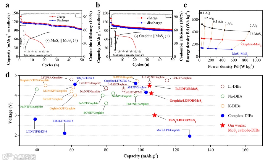 该研究利用常见的MoS2作为正极材料,通过将DFOB-存储在材料中得到了3.0- 5.0 V的电压窗口,并且提供了108 mAh g-1的可逆容量,结合计算证实了该材料较大的层间距有利于阴离子的快速插嵌和脱出,通过多种表征方式分析了MoS2材料在存储DFOB-离子前后的结构变化特性,并且组装了两种全电池体系,对比了该材料在全电池中的电化学性能和循环稳定性。