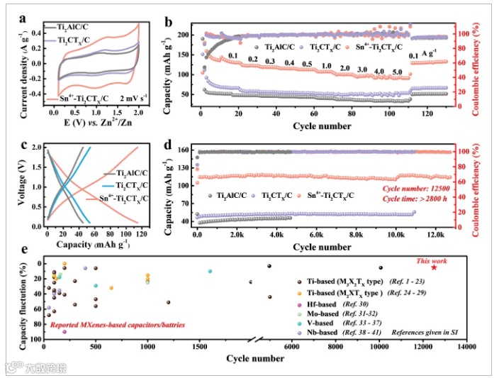综上所述,自发堆积引起的表面势垒和局限的层间间隙是MXens储能中存在的两个主要问题。作者制备了Sn4+预插层的Ti2CTX MXene垂直微球。至此,表面势垒得以消除,层间距得以扩大,锌离子扩散路径明显缩短,反应动力学增强,Zn/MXene电容器实现了12500次循环的超长循环寿命和不超过5%的低容量波动。