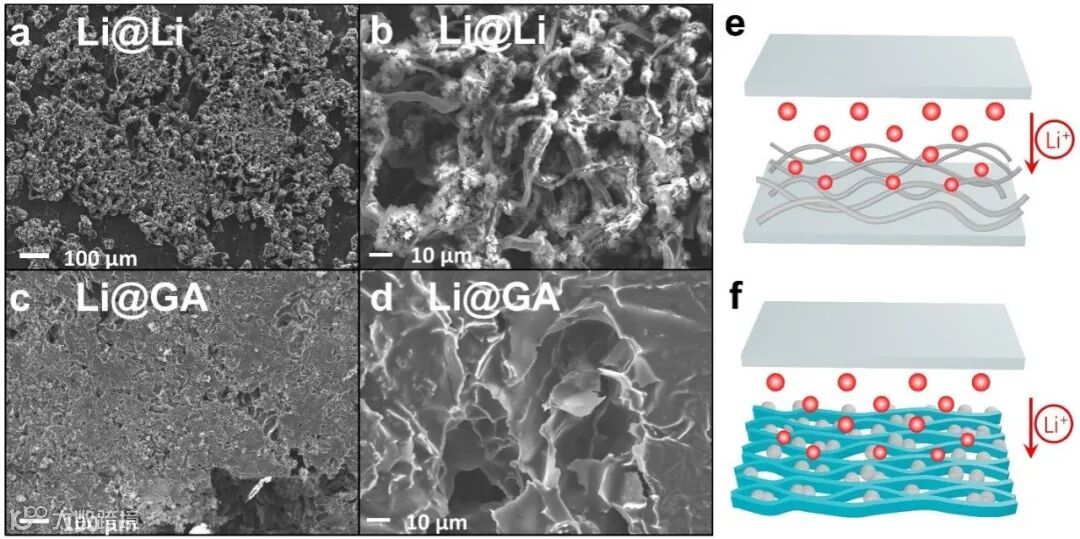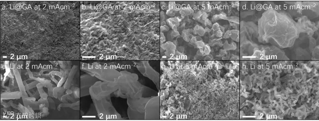 图4. 循环了100 h的LiGA电极及锂片的表面形貌在不同视野下的SEM表征。