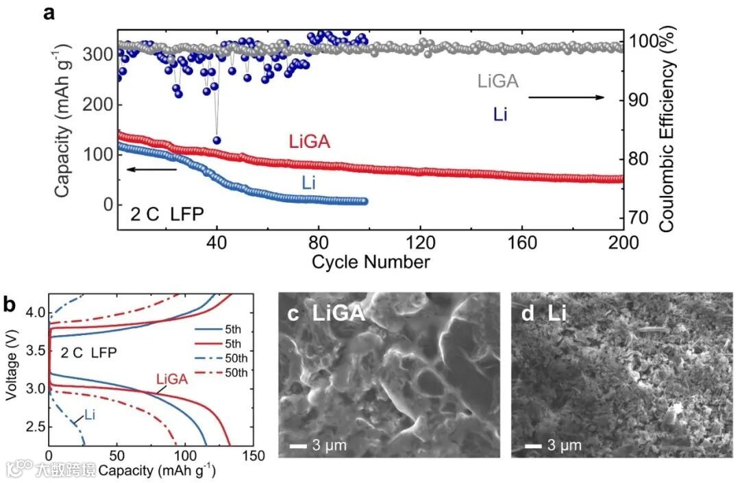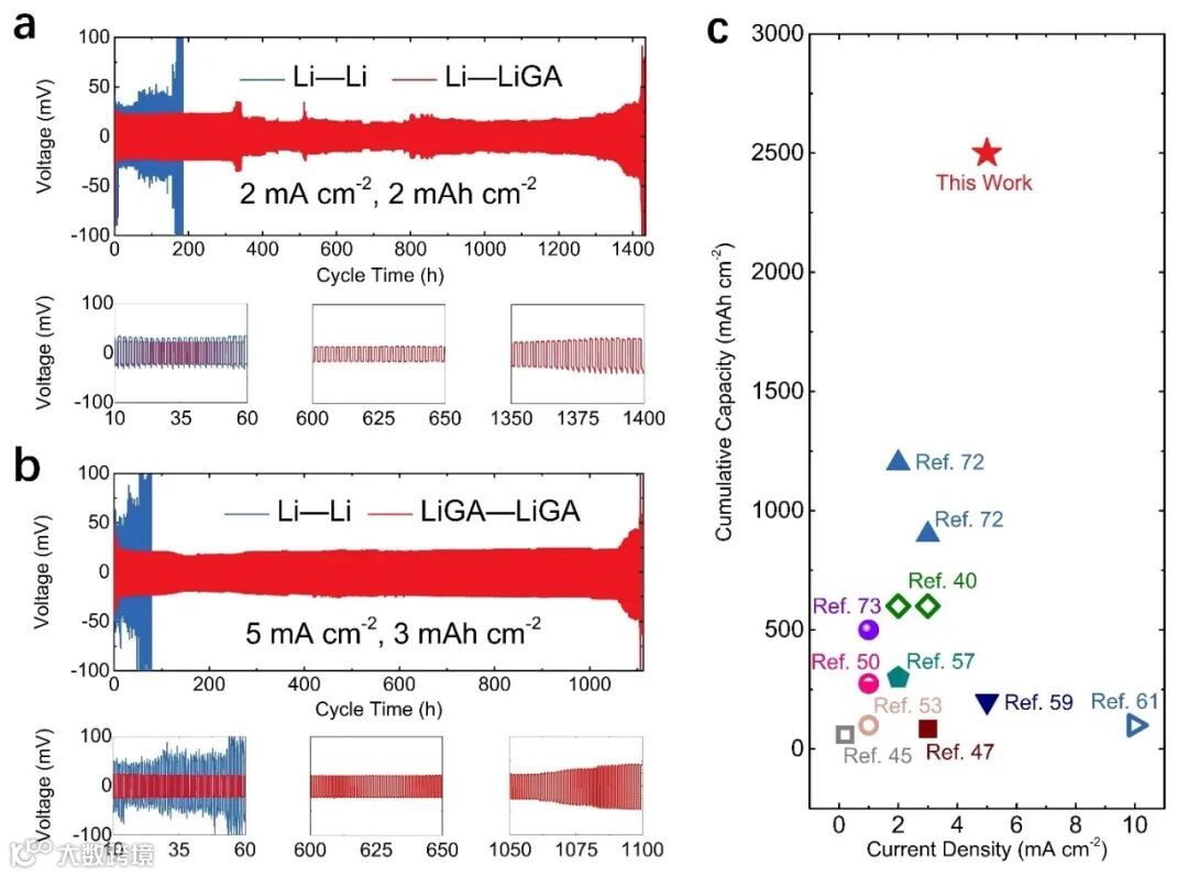 图3. Li-LiGA半对称电池及LiGA-LiGA对称电池的锂金属沉积与去沉积行为的电化学表征。