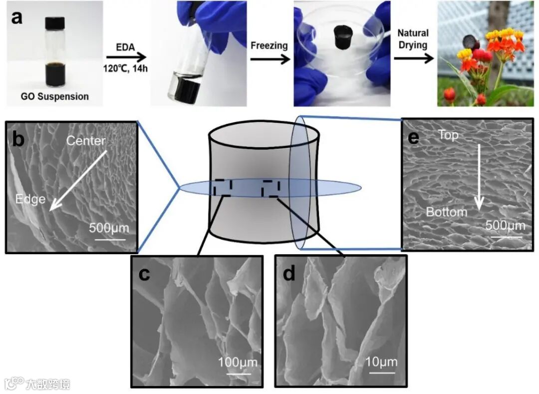 图1.三维梯度孔径结构的自然干燥石墨烯气凝胶的合成与孔径结构的表征。