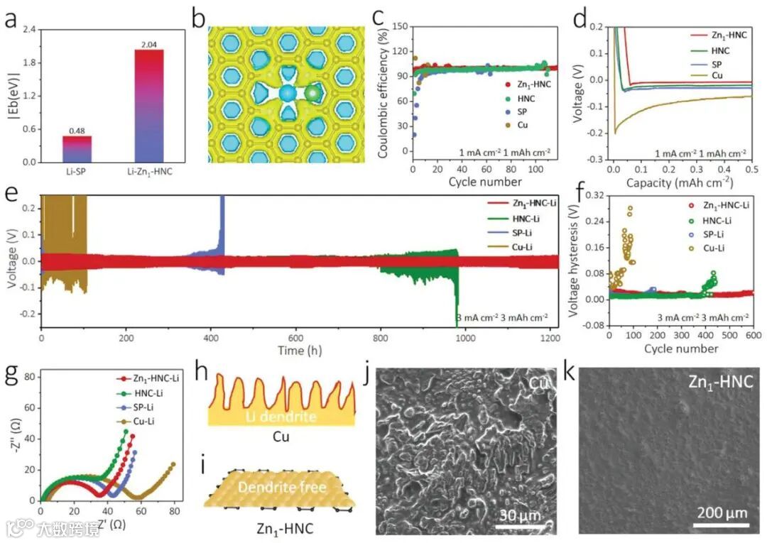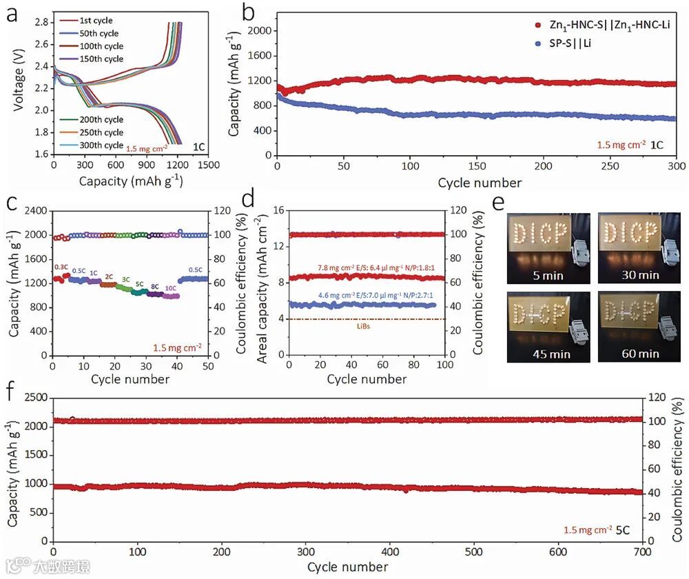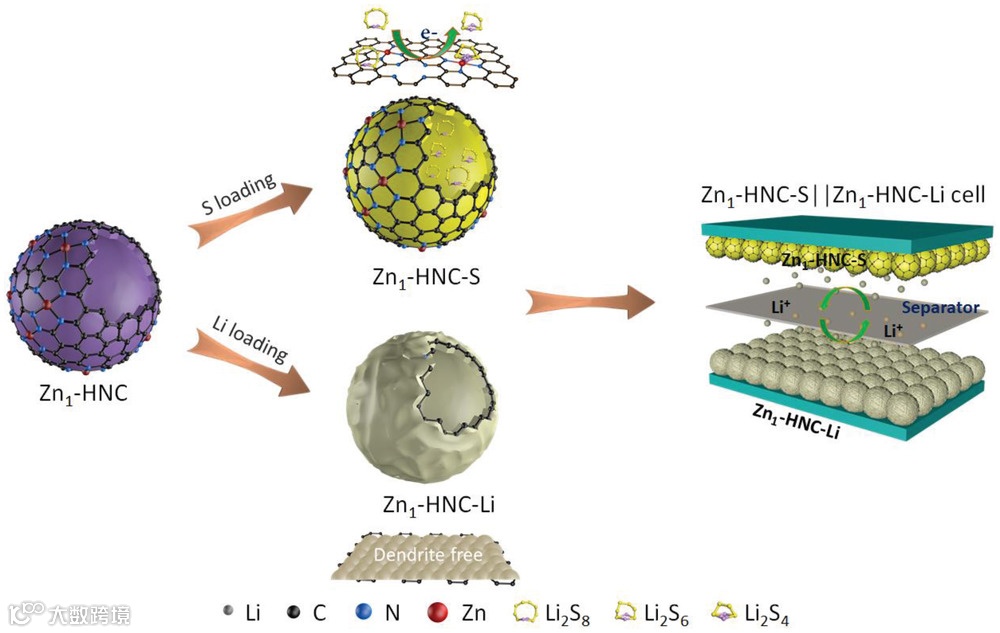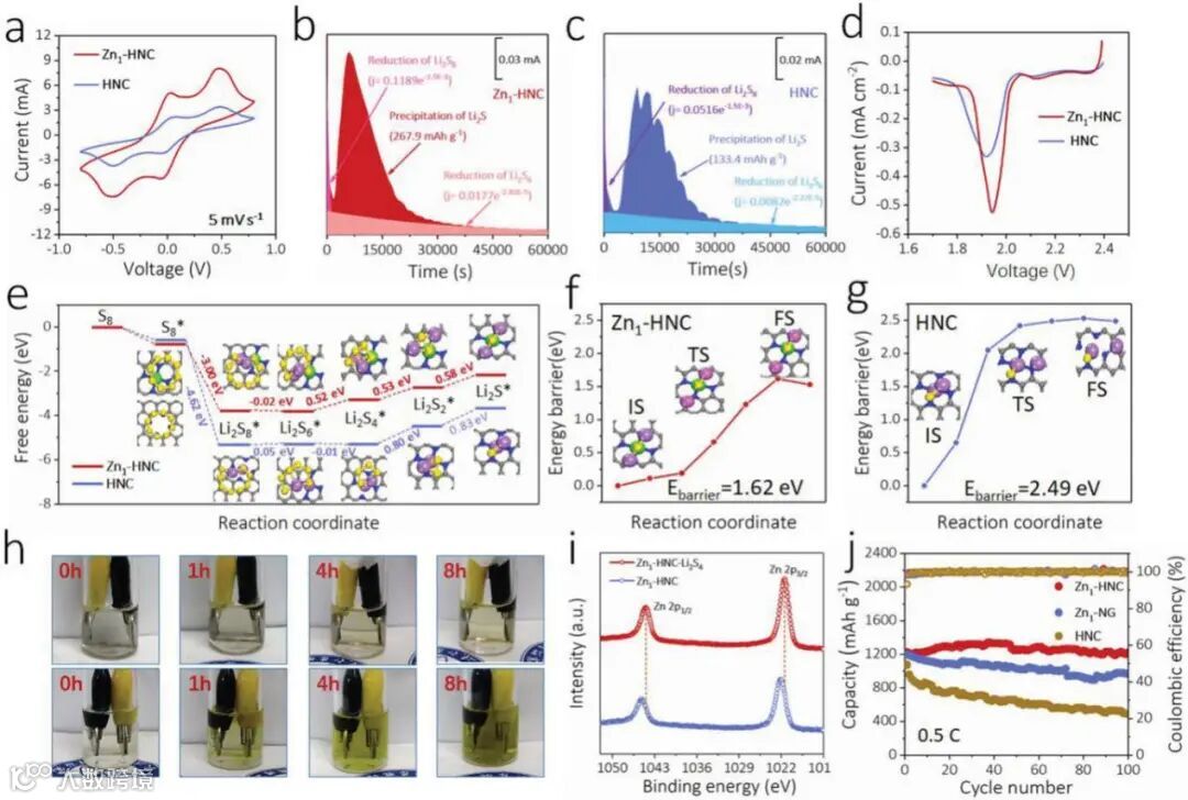 为了进一步验证纳米反应器对多硫化物的强催化能力,作者通过DFT理论计算进一步验证了Zn1-HNC可以降低Li2S的成核势垒,从而加速正极硫的催化转化。通过透明电池验证了Zn1-HNC对多硫化物的强吸附能力。XPS表明,锌单原子与多硫化物之间确实存在较强的化学吸附力。