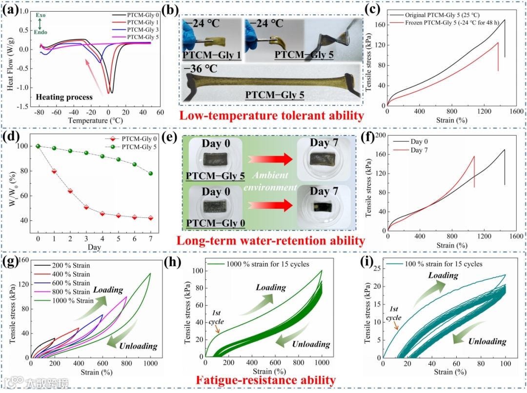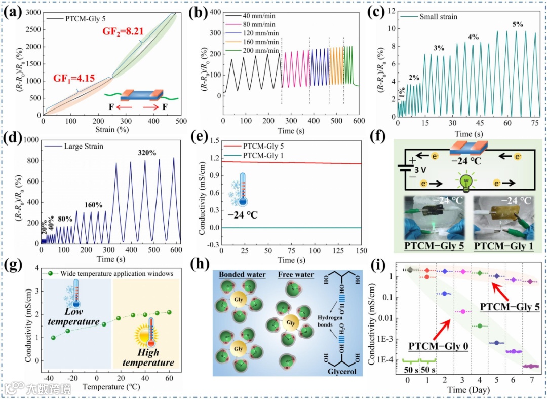 本文采用甘油/水二元混合溶剂作为导电纳米复合有机水凝胶的溶胀剂。由于甘油分子的存在,水分子之间原有的规整氢键结构被破坏,从而有效地抑制了低温下冰晶的形成。因此,制备的有机水凝胶具有优异的耐低温(-24℃,>1000%应变)、长期稳定性(>7d)和导电性。