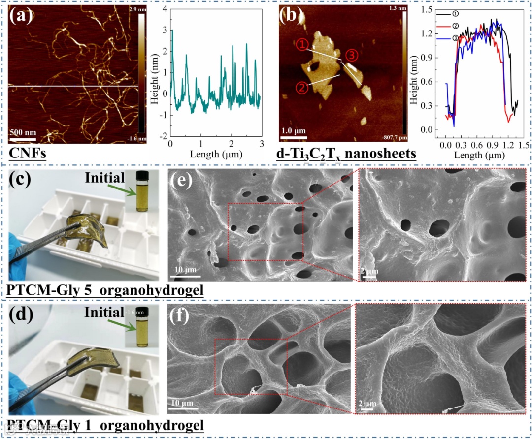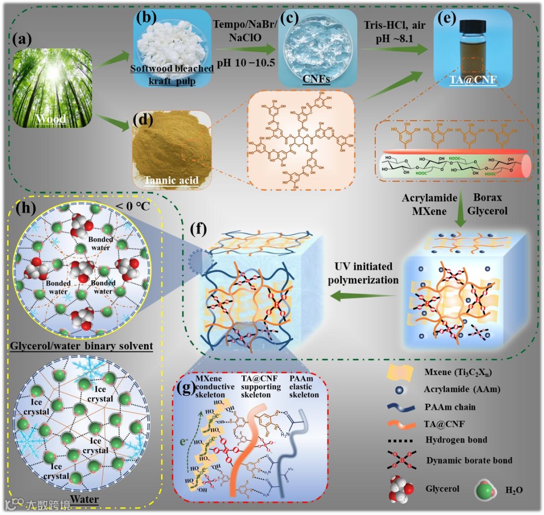 近年来研究发现,利用有机溶剂(乙二醇、离子液体等)部分替代传统水凝胶材料中的溶剂水,或者引入无机盐,可以有效地防止水分子之间形成氢键,从而得到具有优异抗冻性和保水性的有机水凝胶。然而,这些新型导电凝胶体系也面临离子液体泄漏、盐析、机械性能下降和灵敏度低等问题。MXene作为一种新型的二维导电材料,其表面富含羟基、氧或氟等官能团。它具有水分散性好、比表面积大、导电率高等优点,是一种理想的导电添加剂。而纳米纤维素纤维(CNF)作为一种天然高分子材料,具有机械柔韧性高、长径比大、易改性等优点。是一种理想的骨架材料。