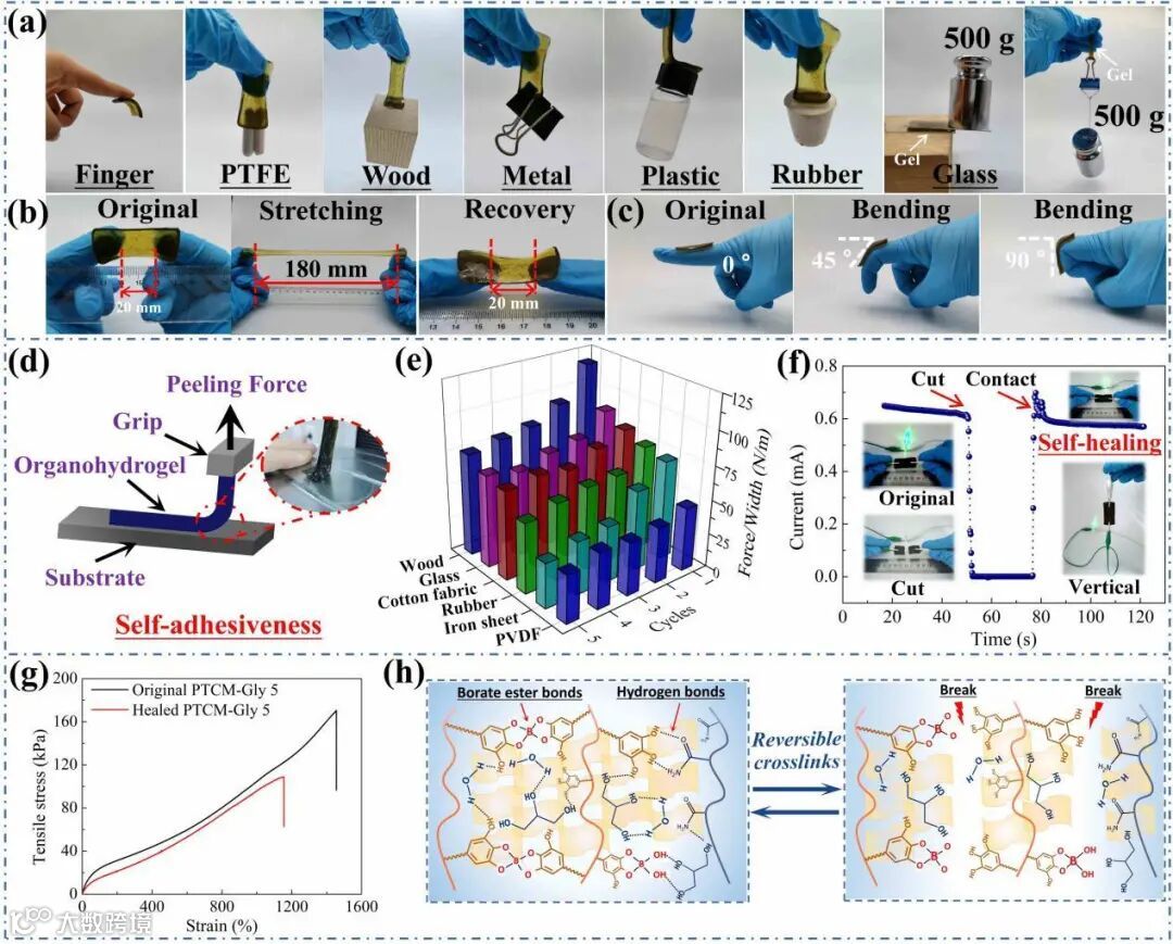 植物多酚(单宁酸)是植物体内复杂的酚类次生代谢产物。它们具有多酚羟基结构,可以通过氢键、离子键和配位键与不同的基底表面动态结合。在本研究中,植物多酚的加入一方面使有机水凝胶具有良好粘附性,为人机交互界面的稳固结合提供了保证;一方面,随着硼砂的加入,水凝胶内部形成了大量的动态羟基-硼酸酯键,加上氢键,有机水凝胶具有良好的自修复性能。