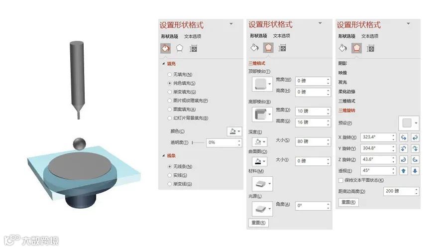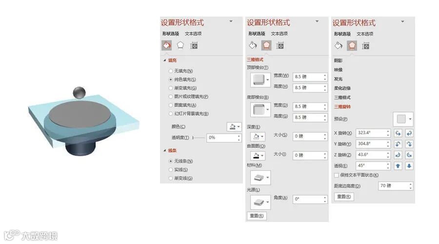 三维旋转:X旋转-323.4°,Y旋转-304.8°,Z旋转-43.6°,透视-45°,距底边高度:椭圆1:70磅。