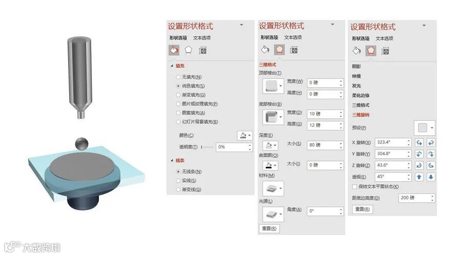三维格式:底部棱台:椭圆1:角度,椭圆2:无,深度-自动,大小:椭圆1:80磅,椭圆2:10磅,材料-最浅,光源-三点,具体参数详见下图;