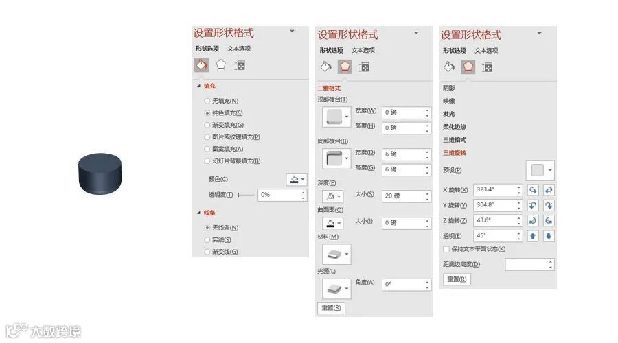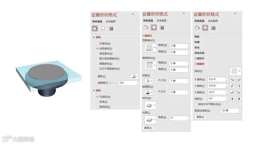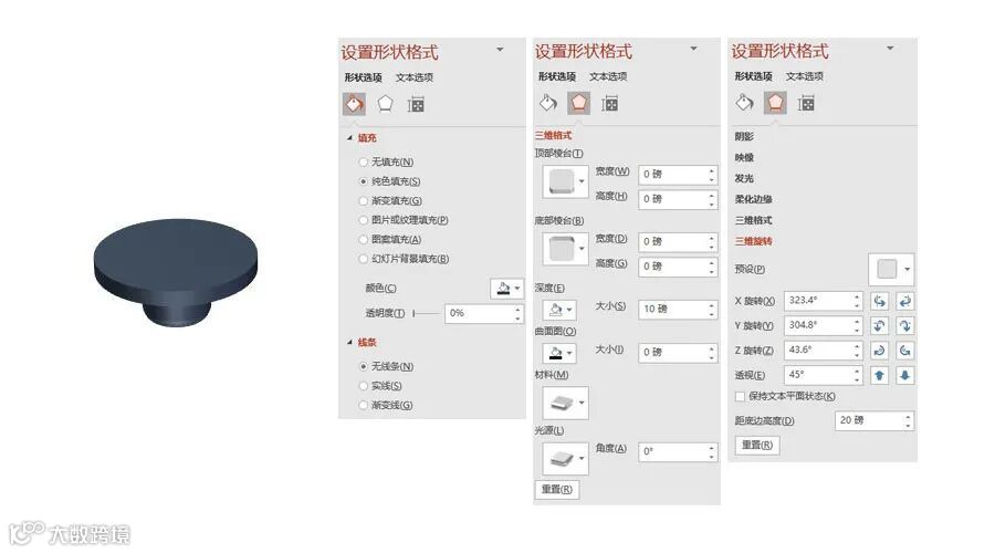 三维旋转:X旋转-323.4°,Y旋转-304.8°,Z旋转-43.6°,透视-45°,距底边高度-20磅。