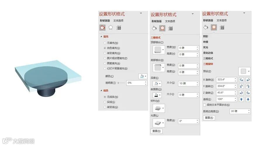 三维格式:深度-自动,大小-10磅,材料-最浅,光源-三点,具体参数详见下图;
