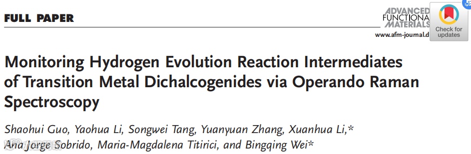 近日,特拉华大学的魏秉庆教授和西北工业大学的李炫华教授等人在国际知名期刊Advanced Functional Materials上发表题为“Monitoring Hydrogen Evolution Reaction Intermediates of Transition Metal Dichalcogenides via Operando Raman Spectroscopy”的论文,郭绍晖为本文的第一作者。