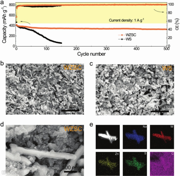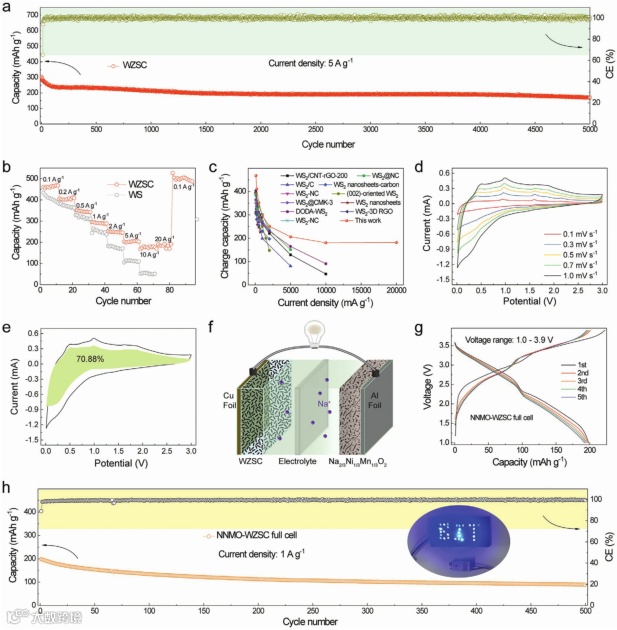 WS2-x/ZnS@C电池在5 A g−1的高倍率下循环5000次后的可逆容量达到了170.8 mAh g−1,有高赝电容贡献率(1mV/s时可达70.88%)。WS2-x/ZnS@C负极和P2-Na2/3Ni1/3Mn1/3O2正极的全电池在1 A g−1循环500次后仍可保持89.4 mAh g−1的可逆容量且效率仍能保持为~100%。