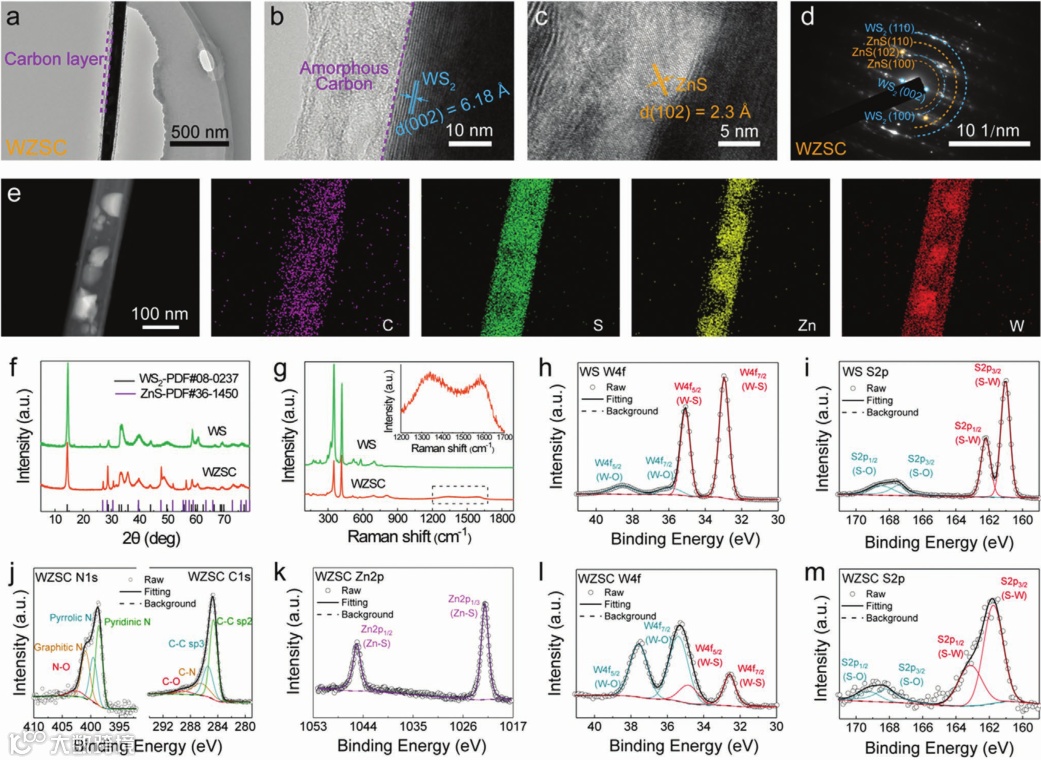 本文在WS2纳米棒的表面上原位生长均匀的ZIF-8层。经过煅烧后,在WS2表面上形成了均匀的碳保护层。此外,由于金属Zn的电负性强于金属W的电负性,因此Zn与S更易结合,进而将诱导WS2/ZnS异质结构的产生,同时在WS2中形成富硫的空位。