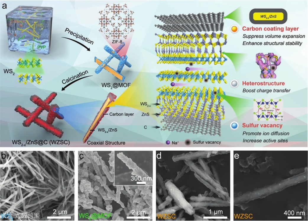 本文设计了一种新型WS2-x/ZnS@C复合材料,主要是通过在二维金属硫化物上原位生在MOF结构,再通过一步煅烧形成。该材料具有丰富的硫空位,均匀的碳包覆层及特殊的异质结构,从而提高材料结构稳定性,促进电子传输,提高离子扩散速率,具有优异的电化学性能。除此之外,通过原位XRD,非原位HRTEM及DFT,阐述了其潜在的电化学储钠机理。该研究再次强调了MOFs辅助结构的设计理念对下一代二次电池系统电极材料的开发具有一定的参考价值。