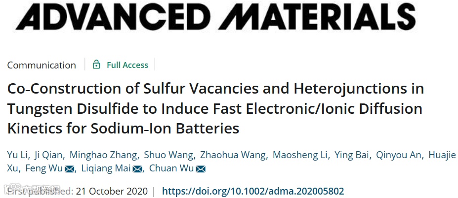 Co-Construction of Sulfur Vacancies and Heterojunctions in Tungsten Disulfide to Induce Fast Electronic/Ionic Diffusion Kinetics for Sodium-Ion Batteries, Adv. Mater. 2020, DOI: 10.1002/adma.202005802