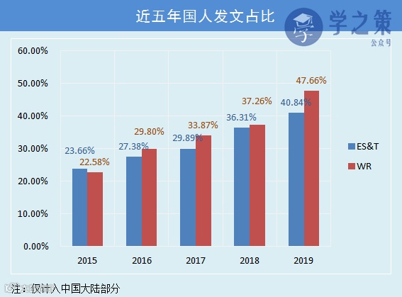 总的来说,国人在这两本期刊上的发文占比逐年增大,从2015年的20%出头到如今已经翻了一番。2015年的时候,国人在ES&T上的发文比WR稍高,但从2016年后在WR的发文占比实现反超,2019年已经领先将近7个百分点。